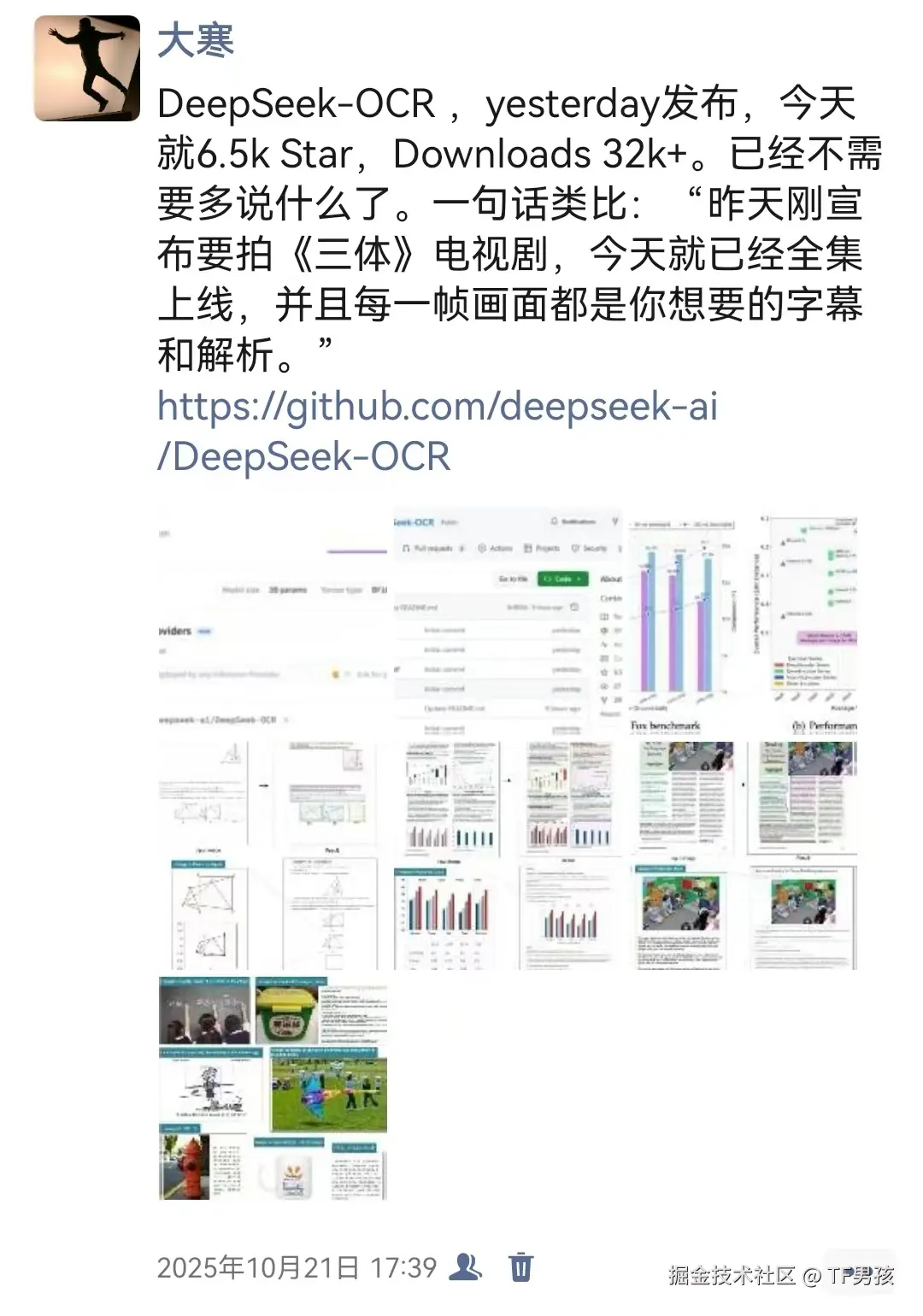 10月21号,DeepSeek-OCR发布的第二天,我发了一个朋友圈说: