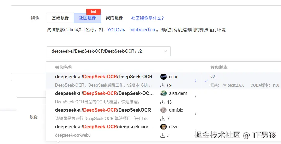 很多算力平台提供这项服务,类似于拎包入住,自动给你部署好你需要的模型环境。我也是用这种方式尝试DeepSeek-OCR。