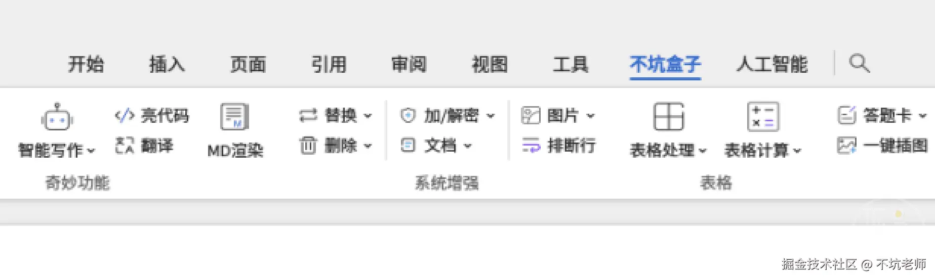 再打开WPS,你的界面中就能看到“不坑盒子”和“人工智能”两个功能区了: