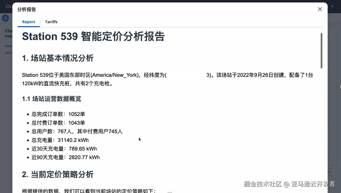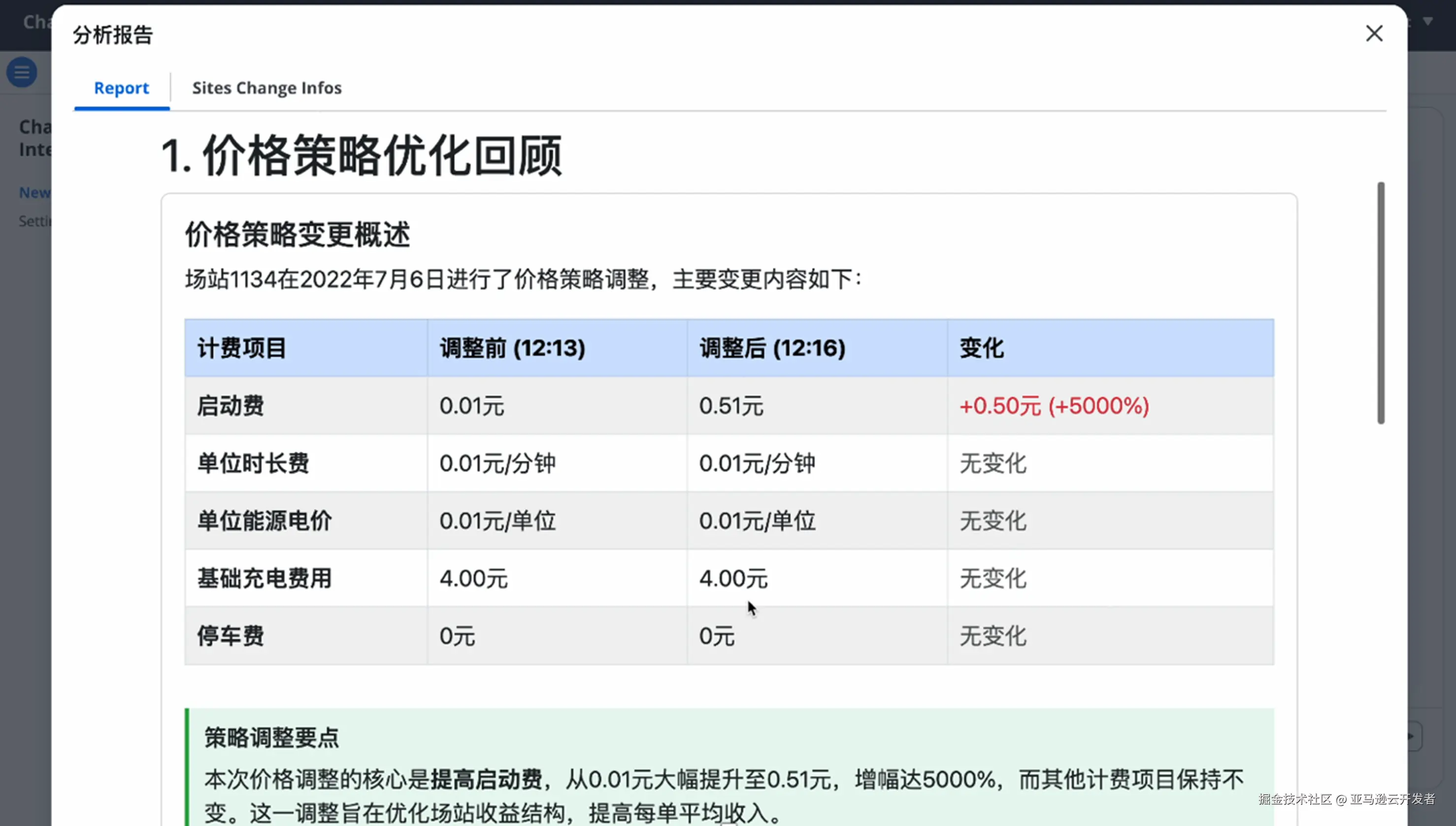 基于收集到的多维度数据,系统生成了一份详尽的智能定价分析报告。该报告展示站点的地理位置特征、历史使用模式、设备状态、电力成本变化等多个维度的信息。通过大模型识别用户行为规律,预测不同时段的需求波动,并结合外部市场因素进行风险评估。这一过程体现了Agentic AI的核心优势——能够处理人类难以同时考虑的多重复杂因素。
