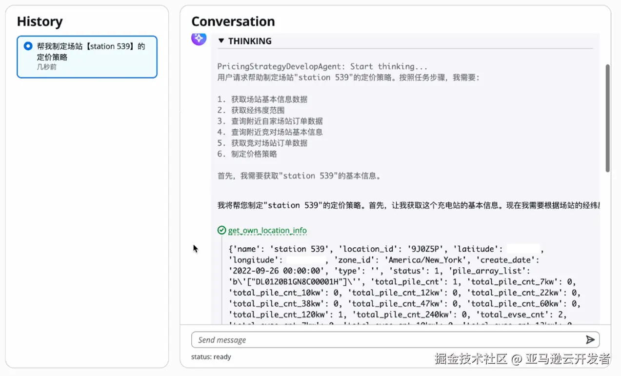 为了更好地展示系统的实际应用效果,我们以制定某充电站的定价策略为例,演示完整的智能定价策略制定流程。当用户通过自然语言输入”帮我制定站点某充电站的定价策略”时,该解决方案立即启动多步骤分析流程。该方案首先进行任务拆解,如获取场站基本信息数据、获取经纬度范围等,然后通过Generative BI工具针对每一个字任务进行数据查询。