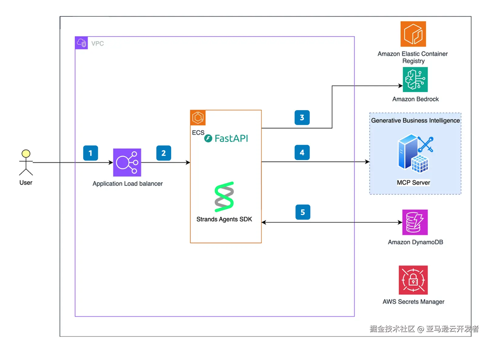 - 容器化应用服务层:ECS容器服务承载基于FastAPI框架的Web应用,该应用同时支持RESTful API和SSE长连接通信。SSE长连接的设计解决了生成式商业智能系统执行复杂分析任务时可能出现的HTTP超时问题。应用集成Strands Agents SDK,支持运行时动态创建和配置Bedrock Agent。