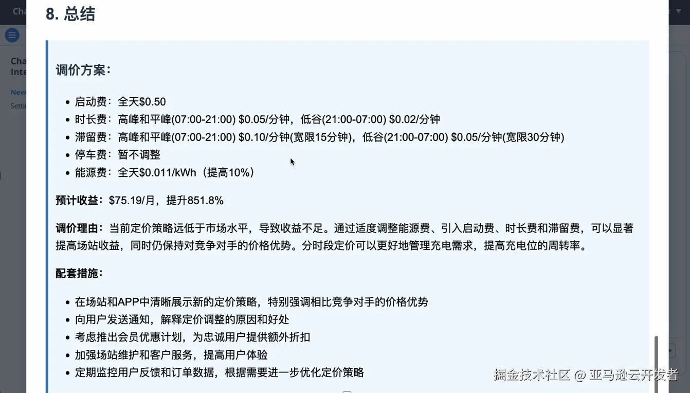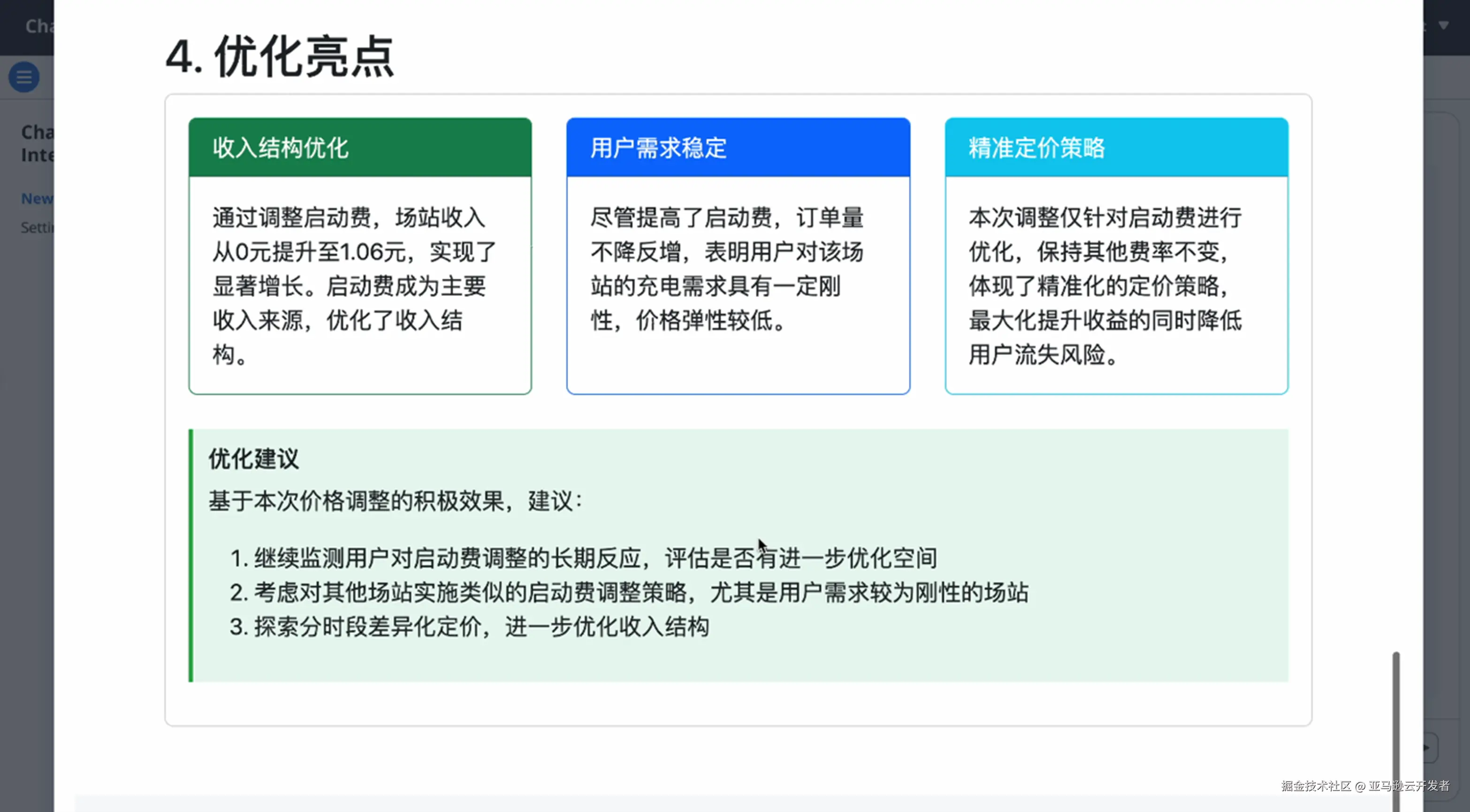 通过这种方式,系统可以快速从海量运营数据中提取相关的历史定价数据、用户行为数据和市场竞争数据。例如,当需要为特定充电站制定新的定价策略时,系统能够通过自然语言交互,精确定位并分析该区域的历史表现数据、用户反馈和竞争对手信息,将复杂的数据分析转化为直观的业务洞察。然后通过Amazon Strands Agents SDK,实现复杂的定价场景,可以调度多个专业化的子 Agent 协同工作,从而综合考虑多个因素(如峰谷电价、设备利用率、竞争态势等),通过多步推理得出最优定价方案。