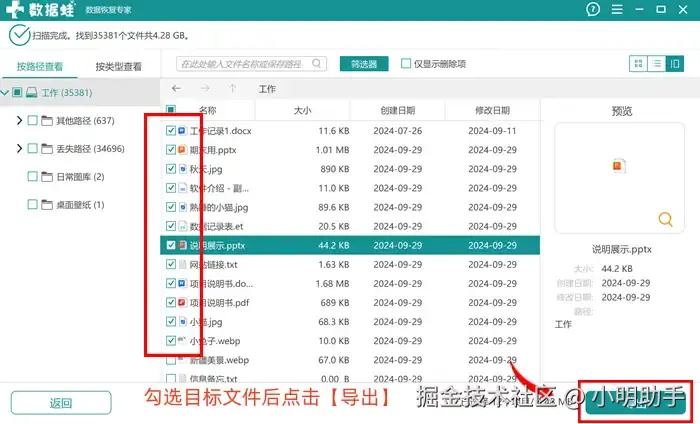 第2步: 不用很久,等到软件的扫描进度条进入到百分百后,进行目标文件的筛选;根据一同扫描出来的信息勾选到目标文件后,点击【导出】让文件进行恢复程序;