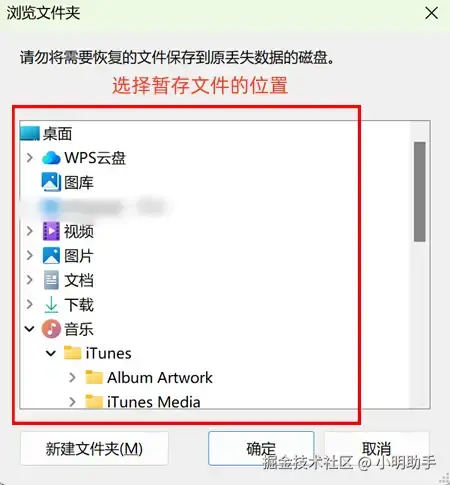 第3步: 点击完【导出】后,在弹出来的【浏览文件夹】中选择好恢复后文件需要存放的位置;切记:不能放回文件丢失的原位置哦。