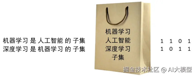 Bag of Words(词袋模型) : 不再关心词序,只统计一个句子里词出现的次数。 缺点是“我爱你”和“你爱我”在它眼里没区别。