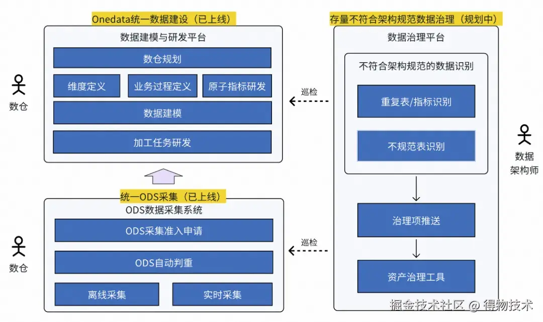 目前我们已在数据采集入仓和数据研发两个环节完成了数据架构能力建设,确保数据的入口(ODS)以及数据仓库的规范性,并再后续通过旁路数据治理的手段进行存量数据的规范化。如下图所示: