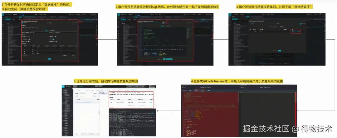 目前重点建设的2个核心功能,分别为:数据质量校验规则,用于监控生产数据质量并进行及时阻断止血,避免下游数据污染;以及数据变更管控流水线,在数据生产变更的环节嵌入消费场景打标、自动化风险扫描、code review、自动化数据测试、发布审批等功能,以全面保障数据质量。融入了数据质量技术体系(红色部分)后的Galaxy数据研发平台架构如下图所示: