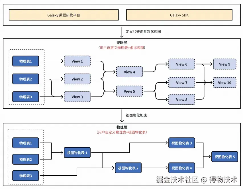 数据逻辑化架构,会存在两层,上层为由用户定义的物理表以及虚拟视图组成的逻辑层,对用户感知;下层为物理表和系统自动生成的视图物化表组成的物理层,对用户不感知,具体如下图所示: