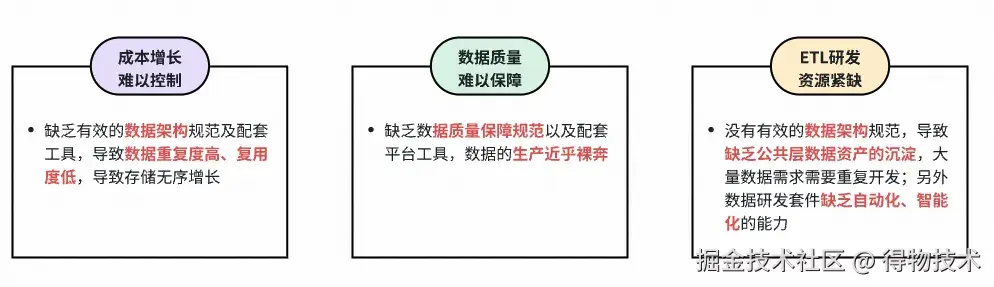 过去整套大数据基础设施我们都使用云上商业化产品(下文简称“云平台”),但在各方面已远无法匹配上得物长期的业务发展。目前得物大数据面临着如下挑战: