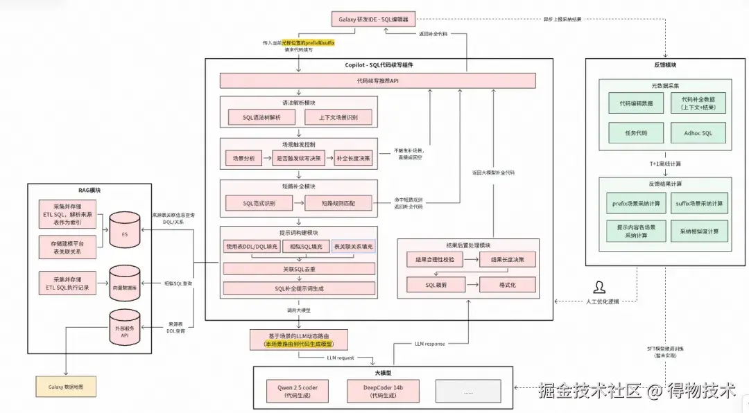 当前我们处于L1的Copilot阶段,通过在数据研发流程中,旁路嵌入基于专家经验规则和大模型的智能SQL代码续写、智能任务诊断、智能SQL代码纠错与优化、 智能质量规则推荐等应用,辅助用户进行高效数据研发。嵌入Copilot后的Galaxy研发平台整体架构如下,主要关注红色部分: