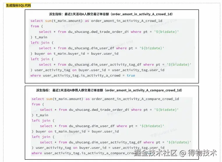 从上图我们也可以看到,原子口径的变更影响非常大,即使可以基于血缘进行变更握手管控,人工修改逻辑也容易改错或遗留。因此我们实现了自动化指标代码生成的能力,基于原子口径自动化生成指标及其物化表的加工逻辑。