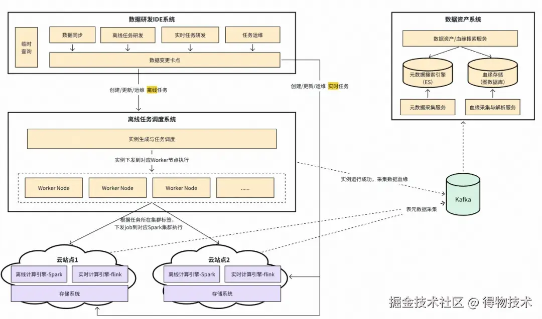 数据研发套件包含数据研发IDE、数据资产系统、离线任务调度系统三部分,在平台中的定位类似于“汽车的驾驶舱”,为数据工程师提供丰富的工具集,控制全公司的数据流动与计算。整体系统架构如下图所示: