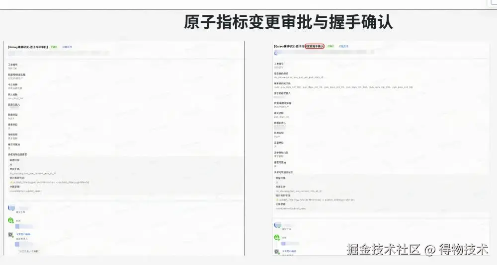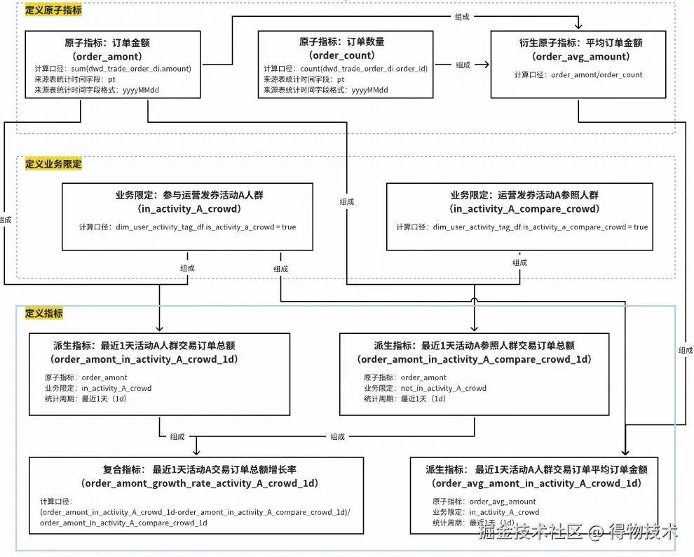 其中最为关键部分为“指标建模”。我们将指标的口径组成拆成了三部分组成:原子指标、业务限定、统计周期,同时在其物化到表上的时候再确定统计粒度。通过原子要素的组合定义指标可以确保同样的指标在公司全局只会有一个,以及标识出不同的汇总表、应用表中的指标是否为同一个。另外当原子口径发生了变化,系统也可以根据血缘关系找到受影响的指标和表,让owner进行握手确认,确保口径变更一致性。例如下图所示: