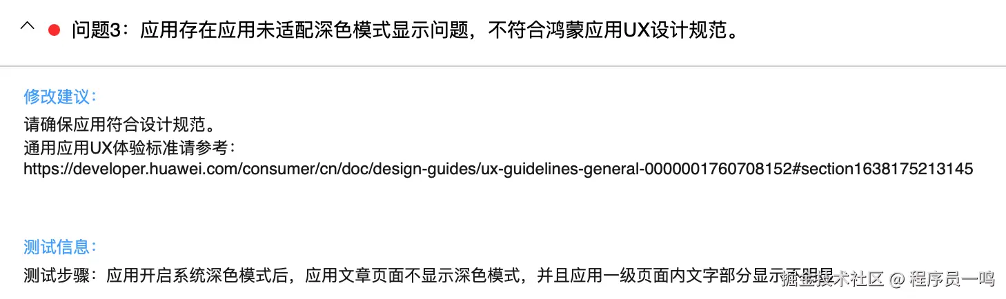 应用上架之前,如果你未考虑到深色模式,大概率会审核不通过,问题原因为:应用存在应用未适配深色模式显示问题,不符合鸿蒙应用UX设计规范。