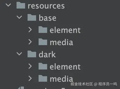 对于资源方式,我们可以在resources中新建dark,创建和浅色对应的颜色和图片资源即可,如下图所示: