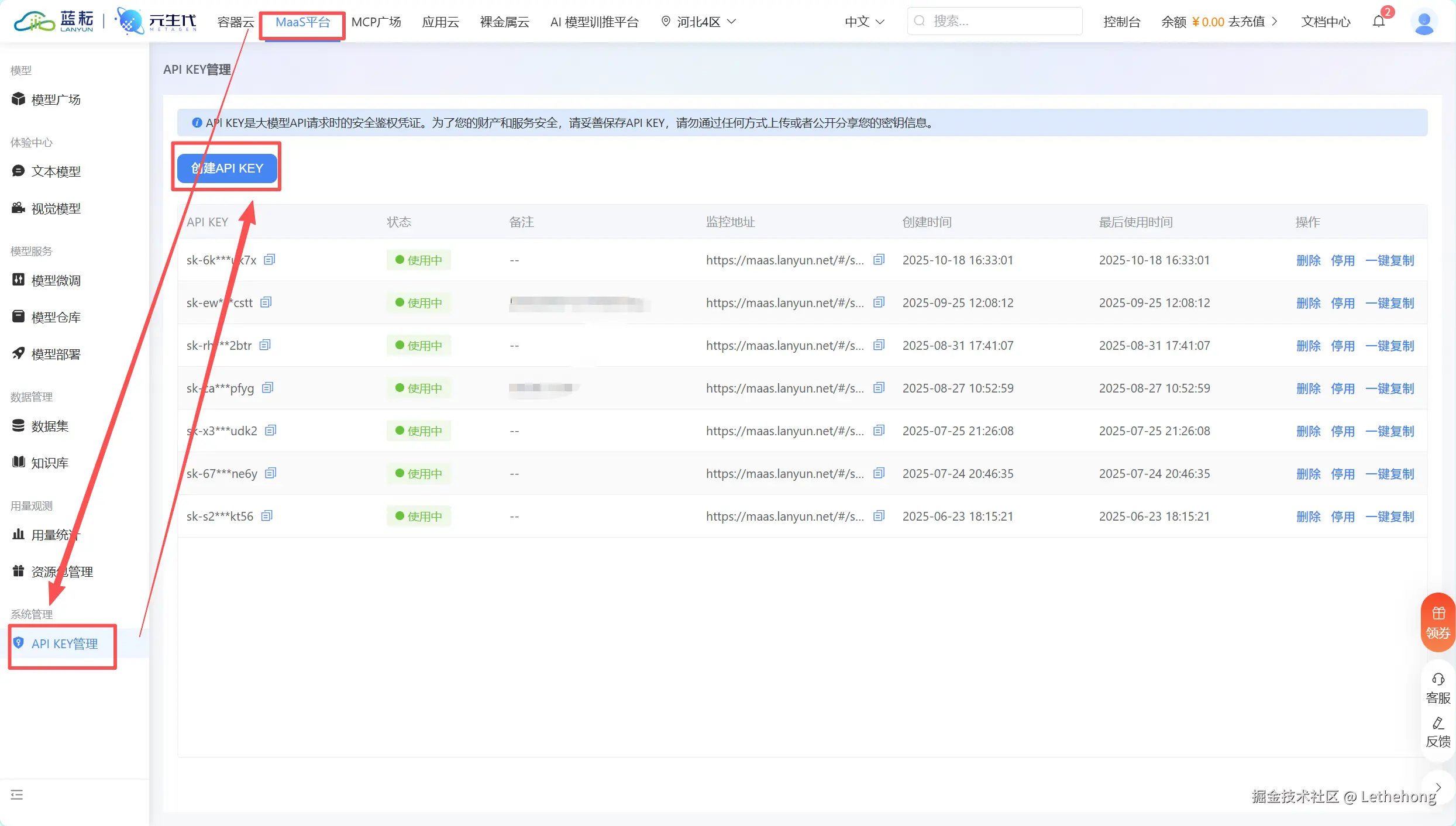点击**蓝耘**访问蓝耘MaaS平台官网完成注册。登录后,在控制台的"API KEY管理"页面,你可以创建专属的API密钥,这是调用所有服务的前提