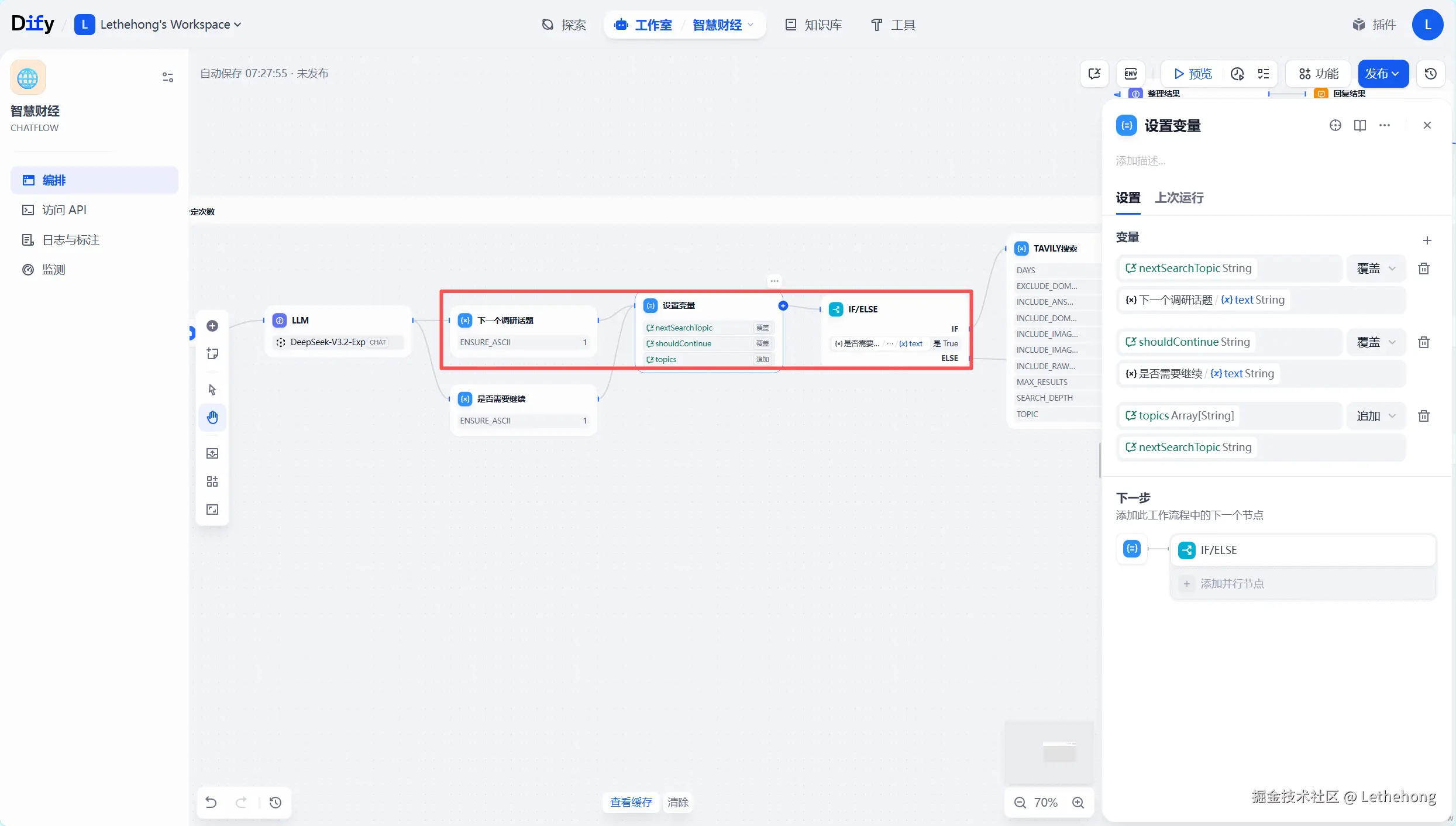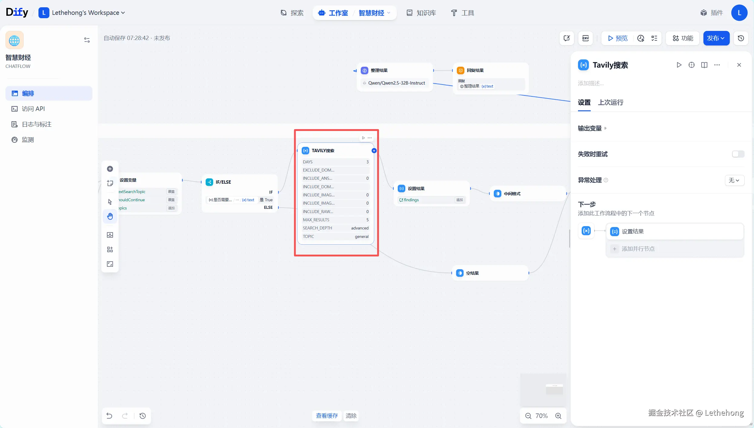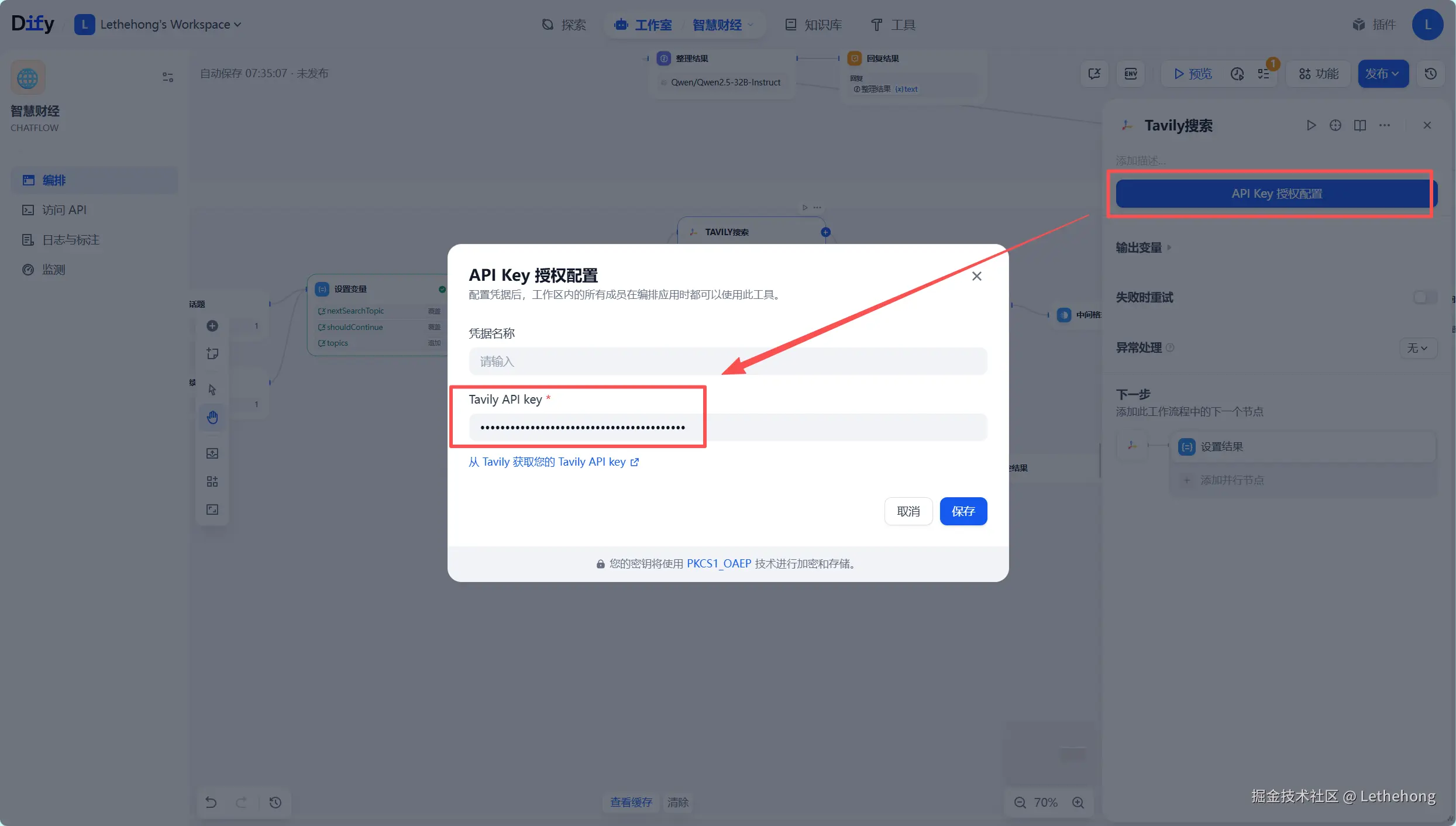 访问Tavily官网(app.tavily.com),获取API密钥和端点地址,在Dify中配置Tavily工具节点,设置搜索参数(时效性、数量、深度等),测试搜索连接有效性。