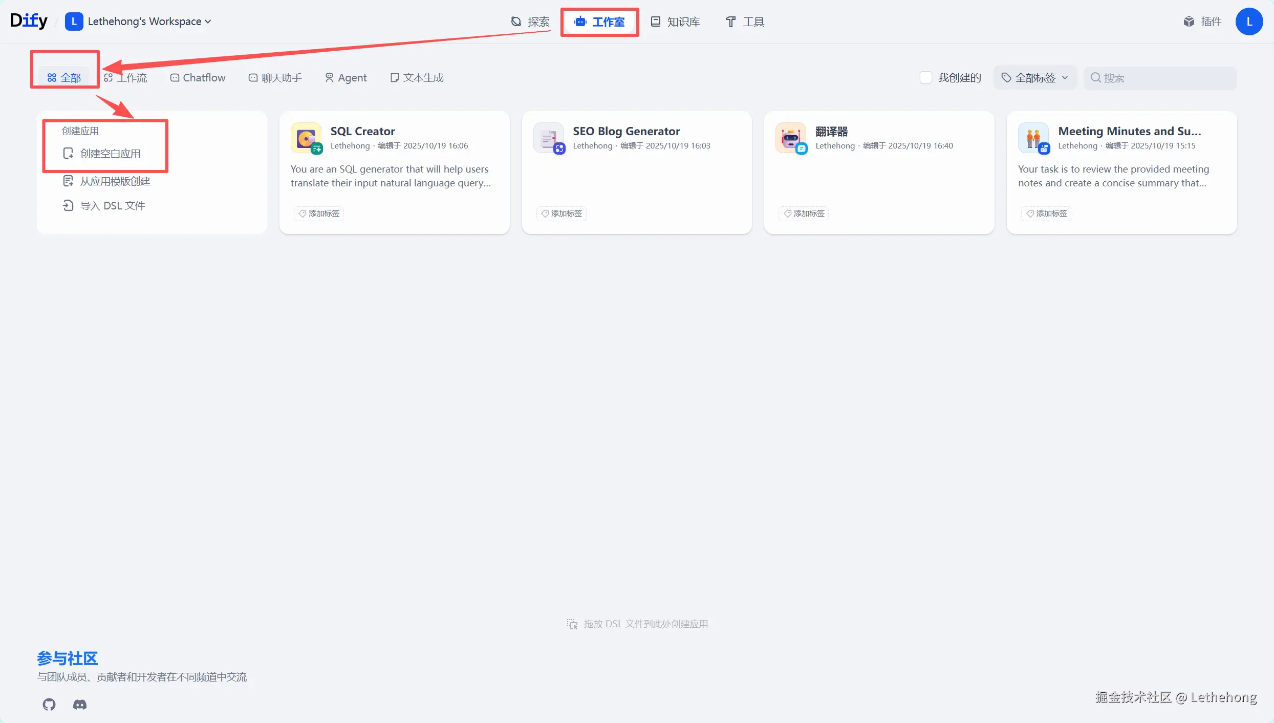 登录Dify平台,进入工作台界面,点击"工作室"选项,进入应用管理页面,选择"创建空白应用",开始构建新的工作流。