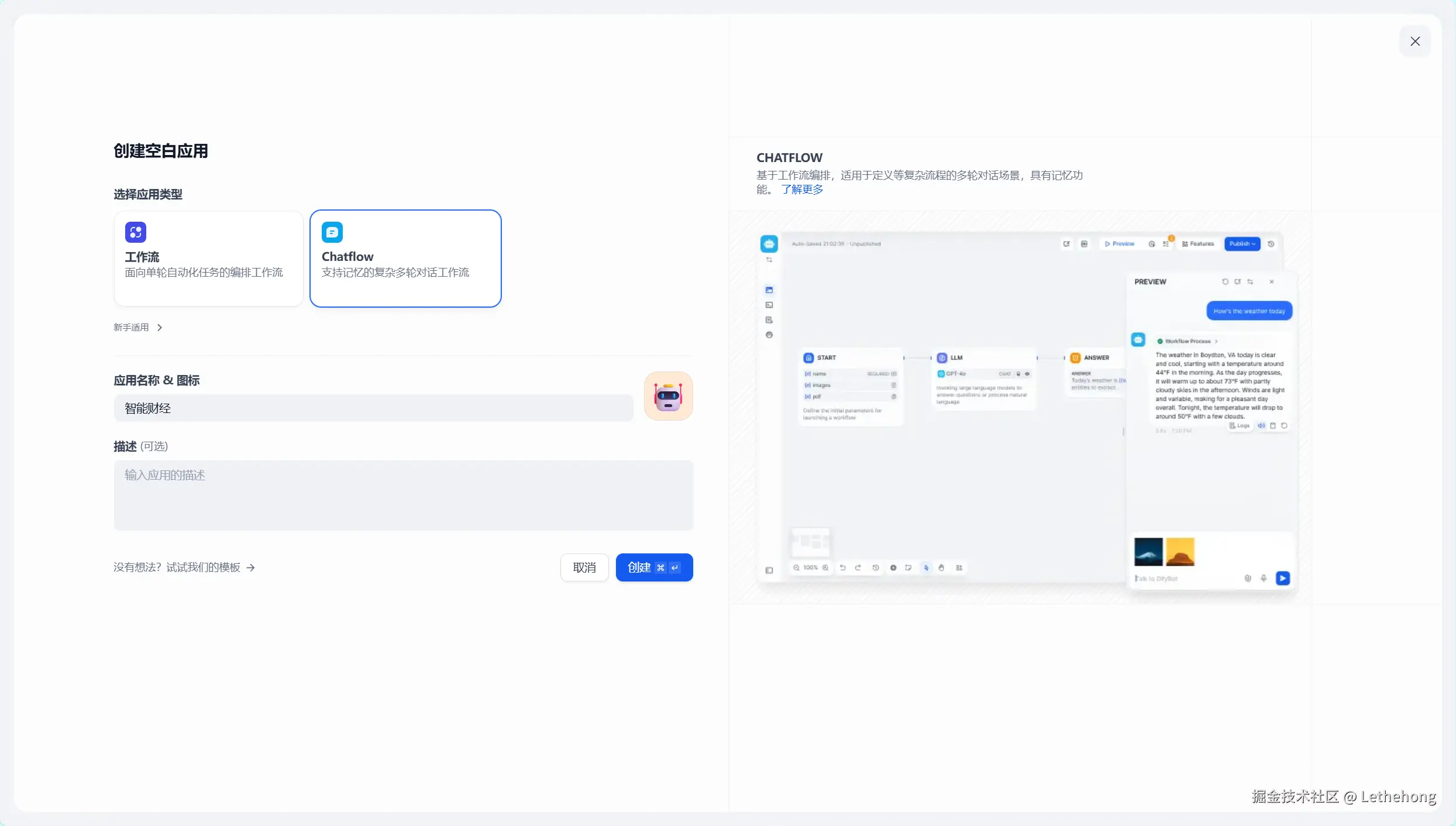 在应用类型中选择"Chatflow",输入具有辨识度的应用名称。