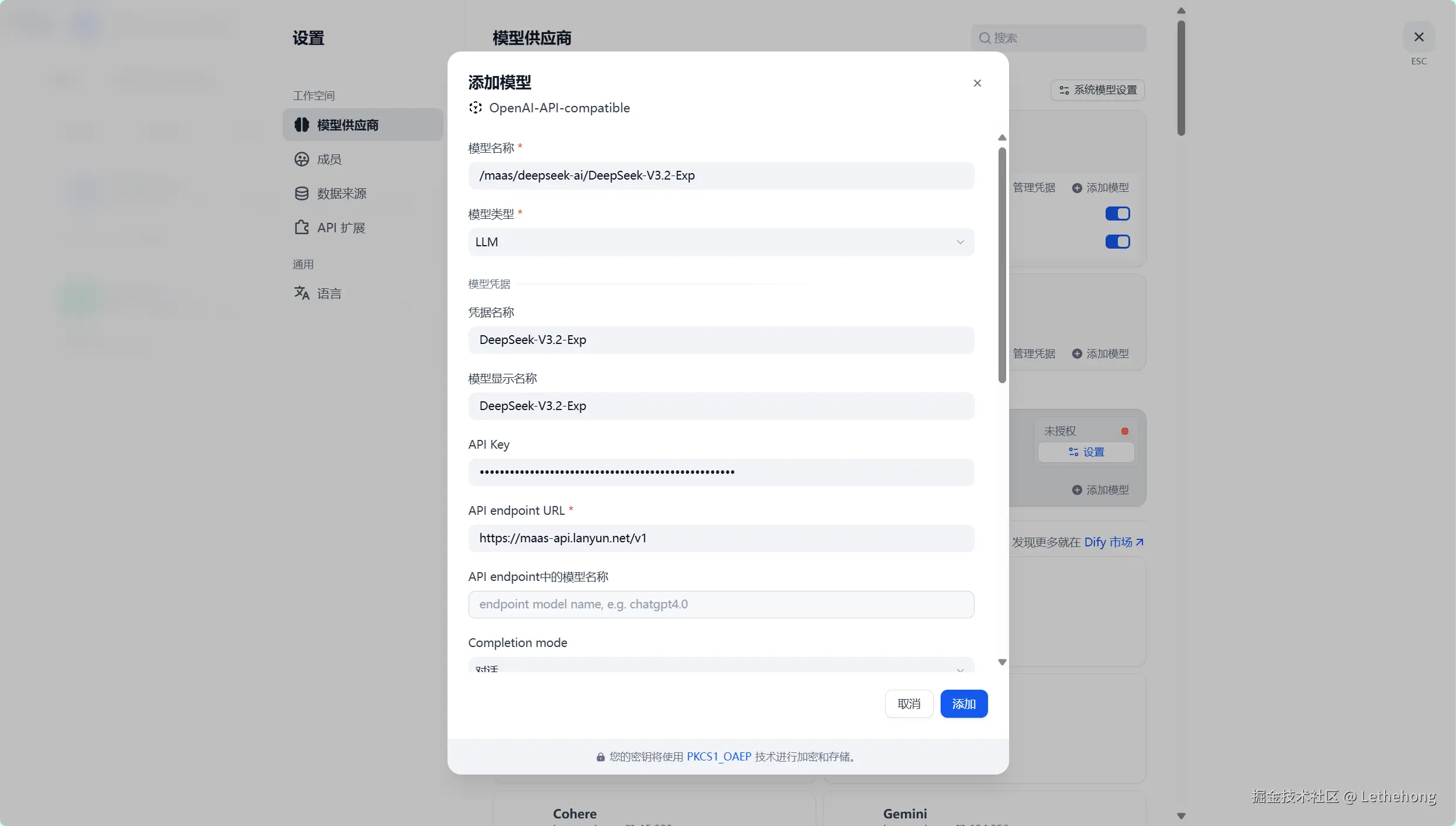 然后在Dify进行添加模型,输入相关信息和API
