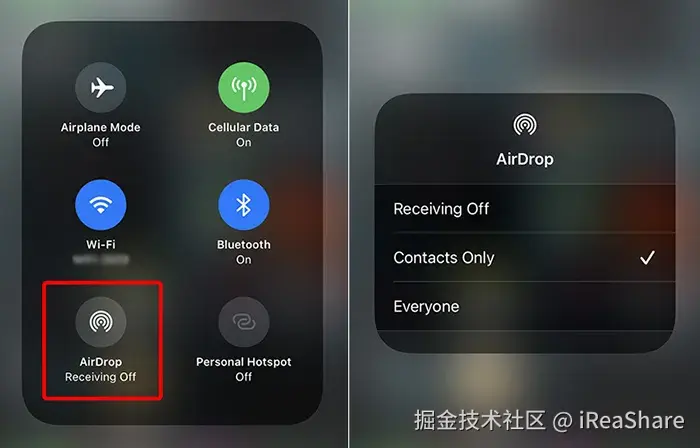 向下滑动(旧型号向上滑动)打开“控制中心”,按住网络设置卡,点击“ AirDrop ”,然后选择“仅限联系人”或“所有人”(建议快速使用)。