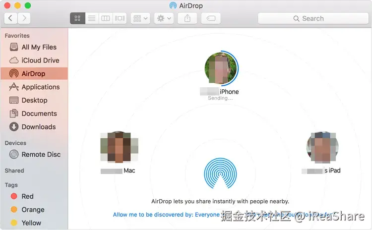 打开Finder ,点击侧边栏中的“ AirDrop ”,并确保“允许我发现你”设置与你的 iPhone 设置一致。两台设备都必须启用蓝牙和 Wi-Fi。