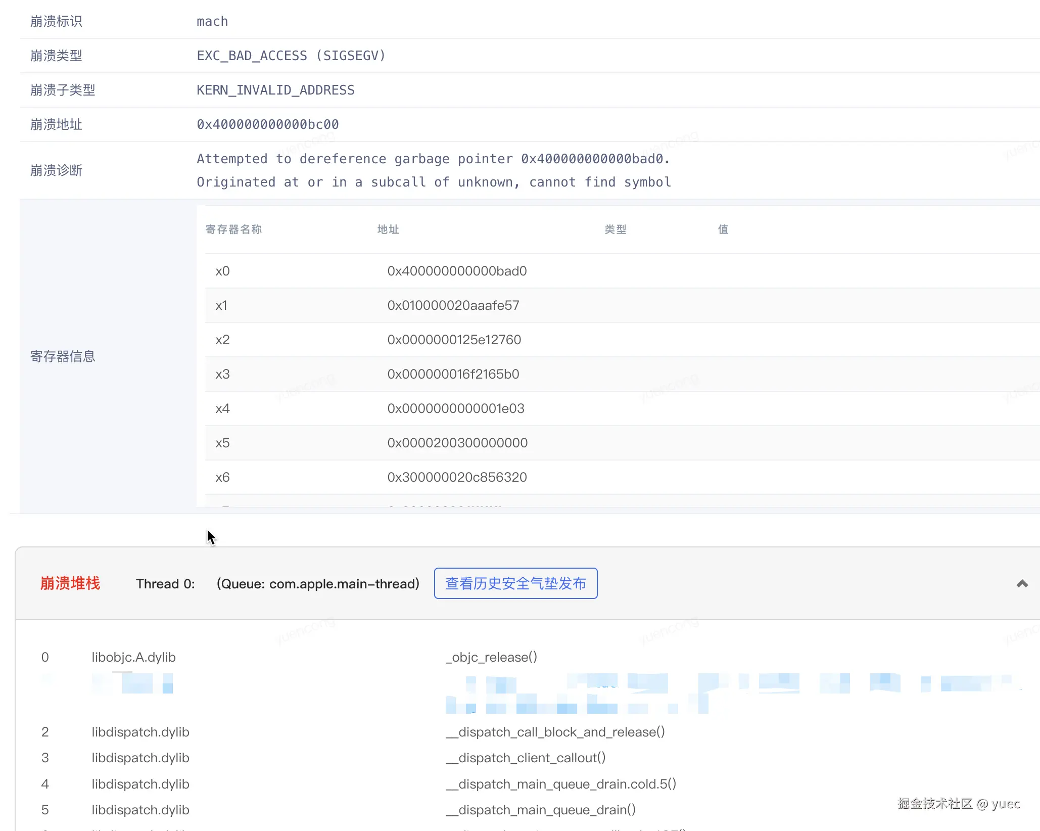 崩溃:ARC 为了保证对象生命周期,会对这个值执行 retain 操作。这导致系统调用 objc_retain(0x4...bad0)。同样,由于这是一个无效地址,程序崩溃,堆栈栈顶指向 objc_retain。