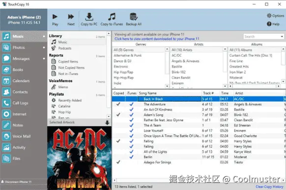 TouchCopy 是一款功能强大的 iPhone 同步软件,支持将 iPhone 和 iPad 上的音乐、照片、信息、联系人等数据备份到电脑,并进行传输和管理。其用户友好的界面和丰富的功能使数据备份和导出变得简单便捷。