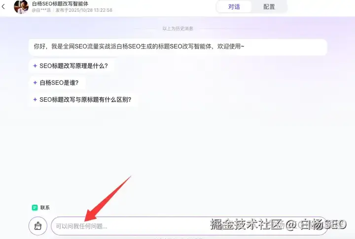 这是白杨SEO付费圈一个成员微信上发私信问我说:“白杨老师,你有没有可以改写标题的智能体?”如图。