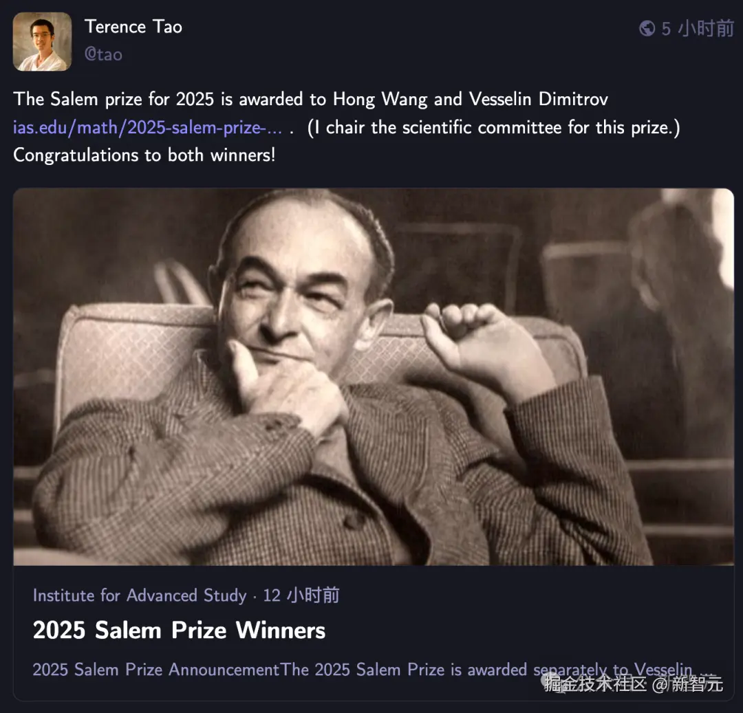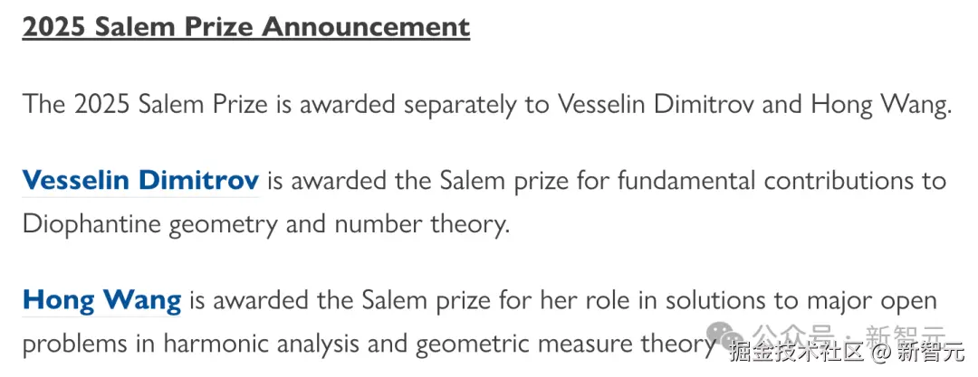 「【新智元导读】刚刚,中国数学家王虹接连斩获两项世界级数学大奖——塞勒姆奖和 ICCM 数学奖金奖,陶哲轩亲自送上祝贺。」
