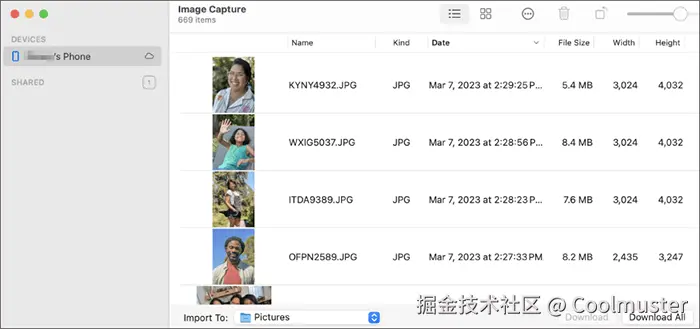 图像捕捉是将 iPhone 照片同步到Mac另一个选择。与照片应用一样,它通常预装在所有Mac电脑上,并且免费使用。使用 USB 数据线将 iPhone 连接到Mac后,您可以预览相机胶卷中的所有照片,并导出您想要的照片。但是,由于需要手动选择,您无法避免导入重复的照片。