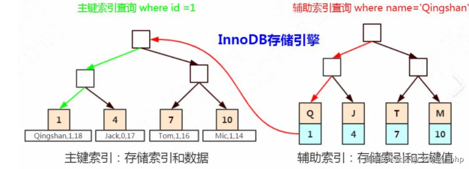 - 辅助索引查询时需要先找到索引叶子节点的主键,再回表查询数据,增加一次IO开销。