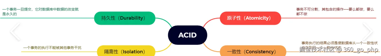 - Durability(持久性):事务提交后,数据永久保存,即使系统崩溃也不会丢失。 -