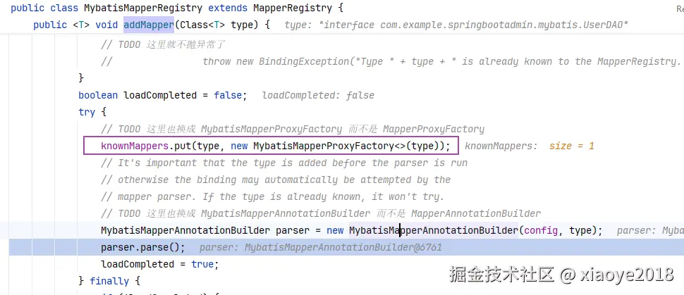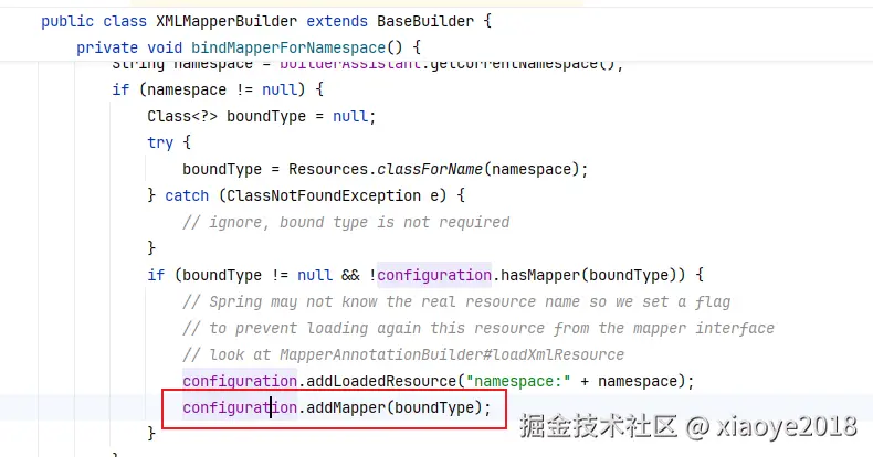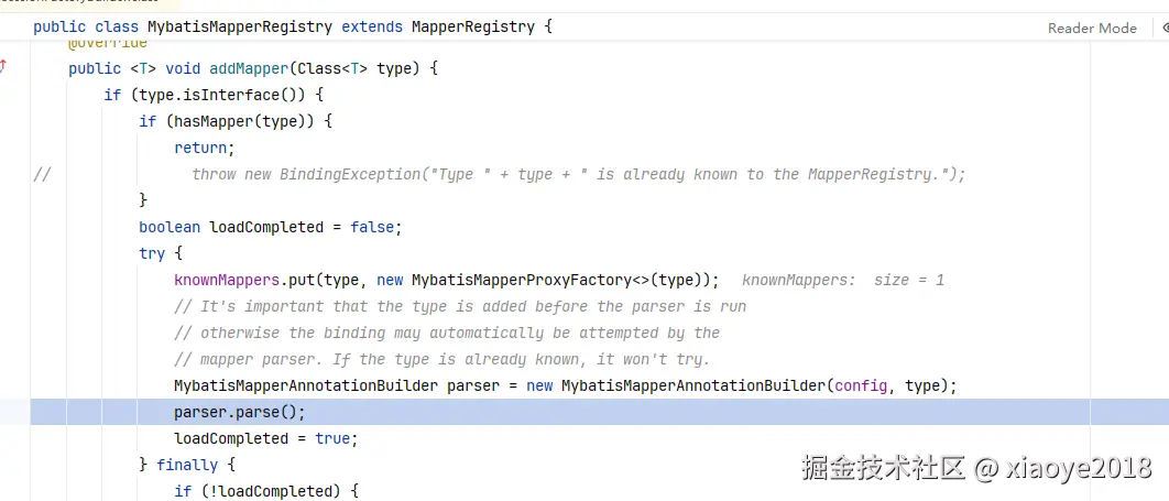 这里会判断Configuration中是否已经有该接口对应的Mapper对象(当定义过相关XML配置的时候,这里不会继续处理), 生成Mapper接口对应的MappedStatement对象