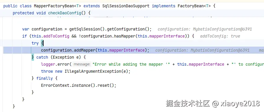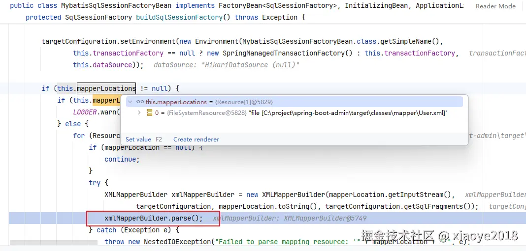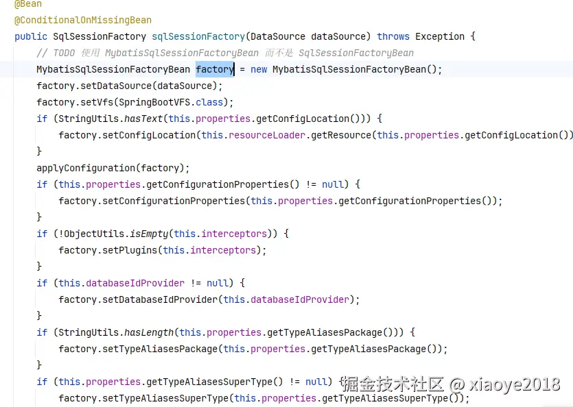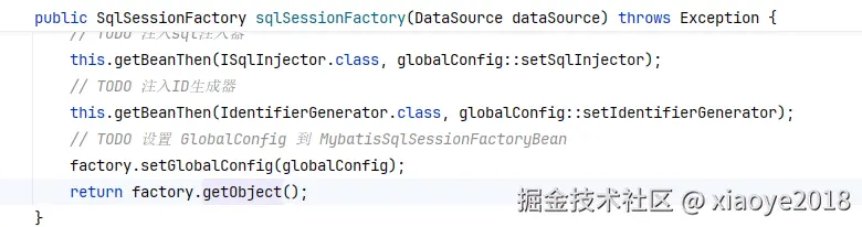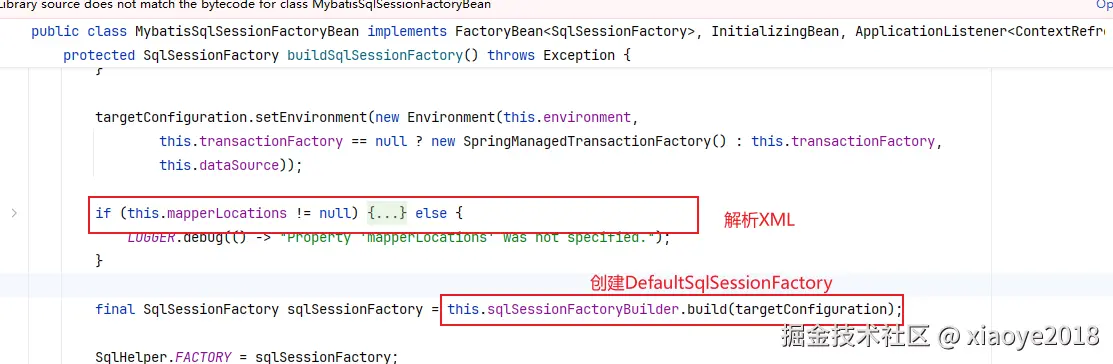 factory.getObject方法会调用 MybatisSqlSessionFactoryBean#afterPropertiesSet。 解析XML、Mapper接口,最终构建SqlSessionFactoryBean。