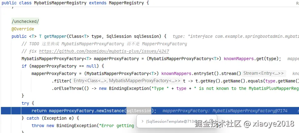 当bean实例化完成后,执行 #getObject方法, 构建Mapper代理对象 MybatisMapperProxy 作为最终的Bean