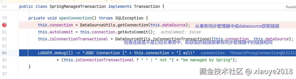 SpringManagedTransaction:在开启SqlSession 的时候,从TransactionFactory中获取的Transaction(此时并没有获取真正的连接,在执行PrepareStatement的时候才会获取底层连接)。