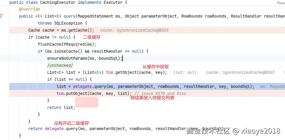 - 先查二级缓存(默认关闭,@CacheNamespace: 默认namespace 独有。 @CacheNamespaceRef),PerpetualCache。 MappedStatement#cache