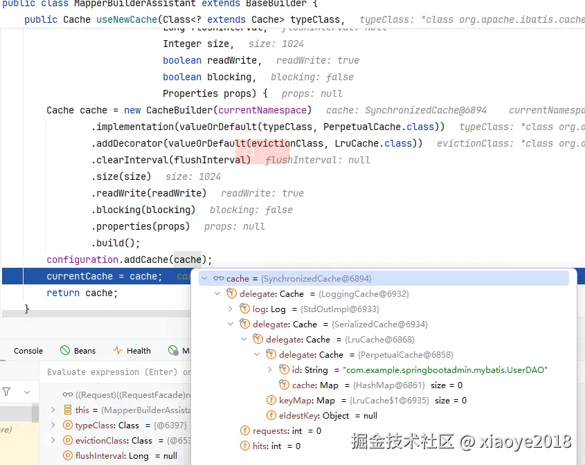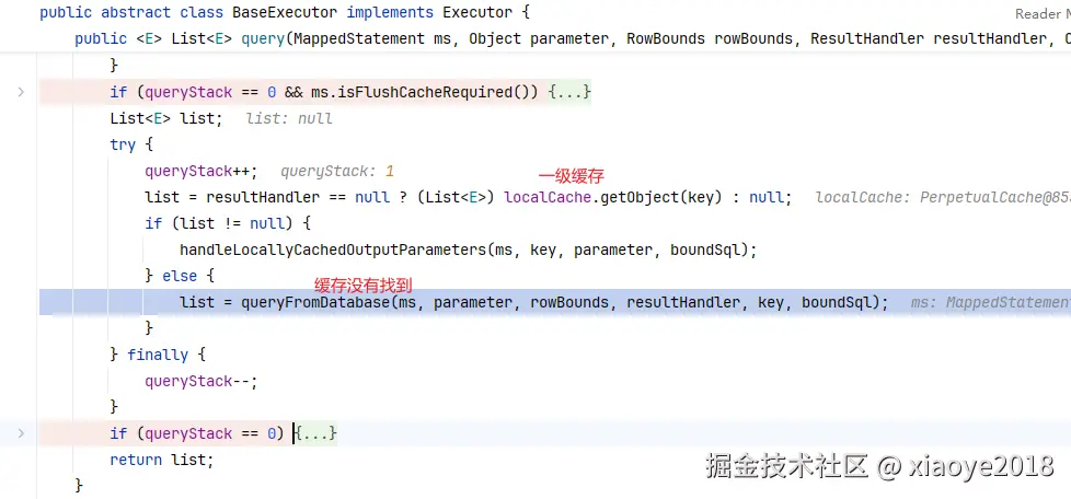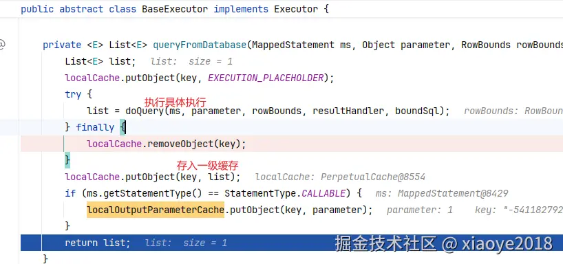 - 再查一级缓存: sqlSession级别,在创建Executor时生成 PerpetualCache, BaseExecutor#localCache。