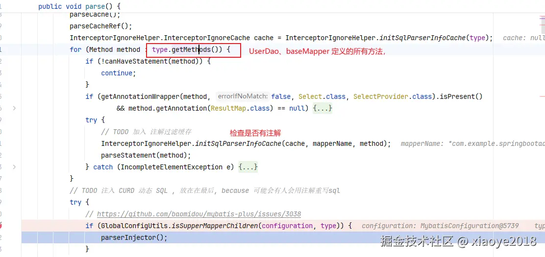 然后检查接口方法是否有mybtis注解:进行替换BaseMapper的CRUD方法。 MybatisMapperAnnotationBuilder#statementAnnotationTypes