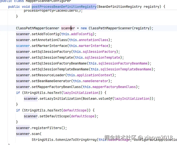 MapperScannerConfigurer 实现了BeanDefinitionRegistryPostProcessor, postProcessBeanDefinitionRegistry方法中会生成ClassPathMapperScanner对象进行扫描basePackage目录的接口类。