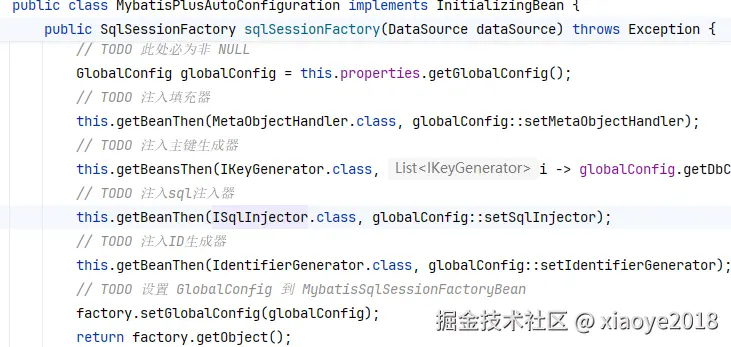 由于SqlSessionFactory、SqlSessionTemplate 在MybatisPlusAutoConfiguration中都已经定义了Bean,因此下面的setSqlSessionFactory、setSqlSessionTemplate都会执行一遍。