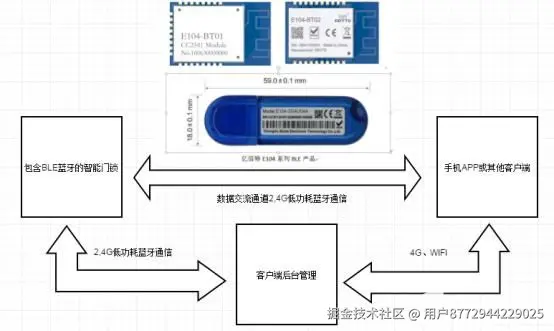 手机或者智能设备开锁客户端主要作用是负责和智能门锁的低功耗蓝牙进行通信、识别用户输入的开锁密码、执行用户的操作指令;低功耗蓝牙的智能门锁执行机构,此部分是低功耗智能门锁的核心部分,其主要作用是负责匹配和客户端的通信连接、根据要求执行开锁指令或者其他操作指令;客户端管理后台主要作用是涉及到门锁的初始化、门锁设置命令的处理(比如密码设置、密码修改等)。其应用案例框图如下所示:
