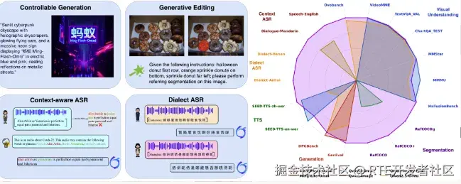 该模型在多模态能力上进行了关键优化,特别是在语音识别方面,实现了上下文 ASR(ContextASR)和方言感知 ASR 的 State-of-the-Art 性能,在全部 12 个 ContextASR 基准测试中均设定了新的 State-of-the-Art 性能,并显著提升了对 15 种中文方言的识别性能。在图像生成方面,Ming-flash-omni Preview 引入了高保真文本渲染,并在图像编辑过程中展示了场景一致性和身份保留方面的显著增益。此外,模型引入了生成式分割(Generative Segmentation),该能力不仅实现了强大的独立分割性能,还增强了图像生成中的空间控制,并改善了编辑一致性。