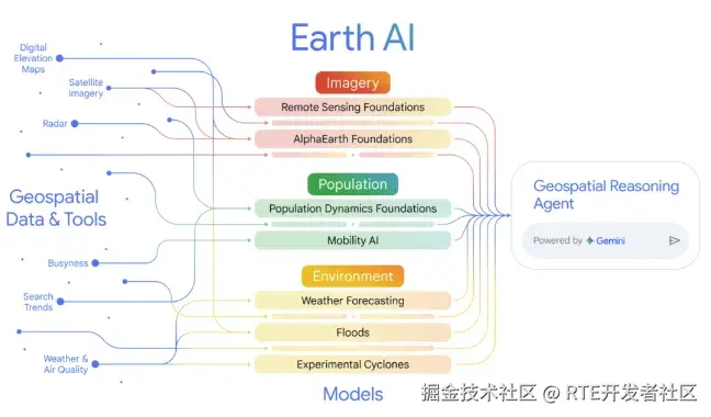 谷歌表示,Earth AI 的核心在于将影像、人口与环境等多领域模型与推理 Agent 结合。