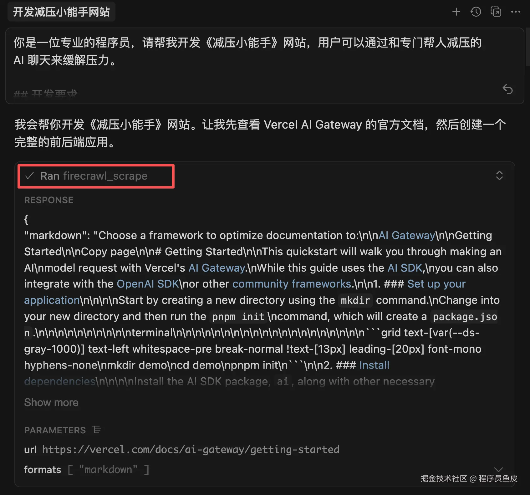 点击执行后,AI 会先调用 MCP 工具从网页中获取到信息,这里我用的是 Firecrawl MCP:
