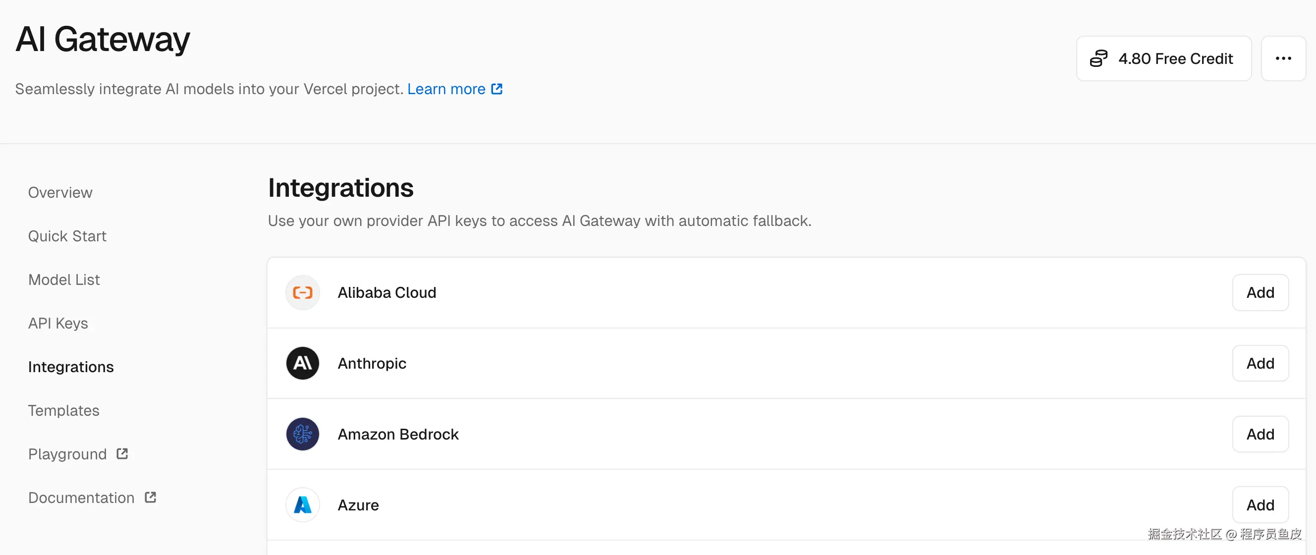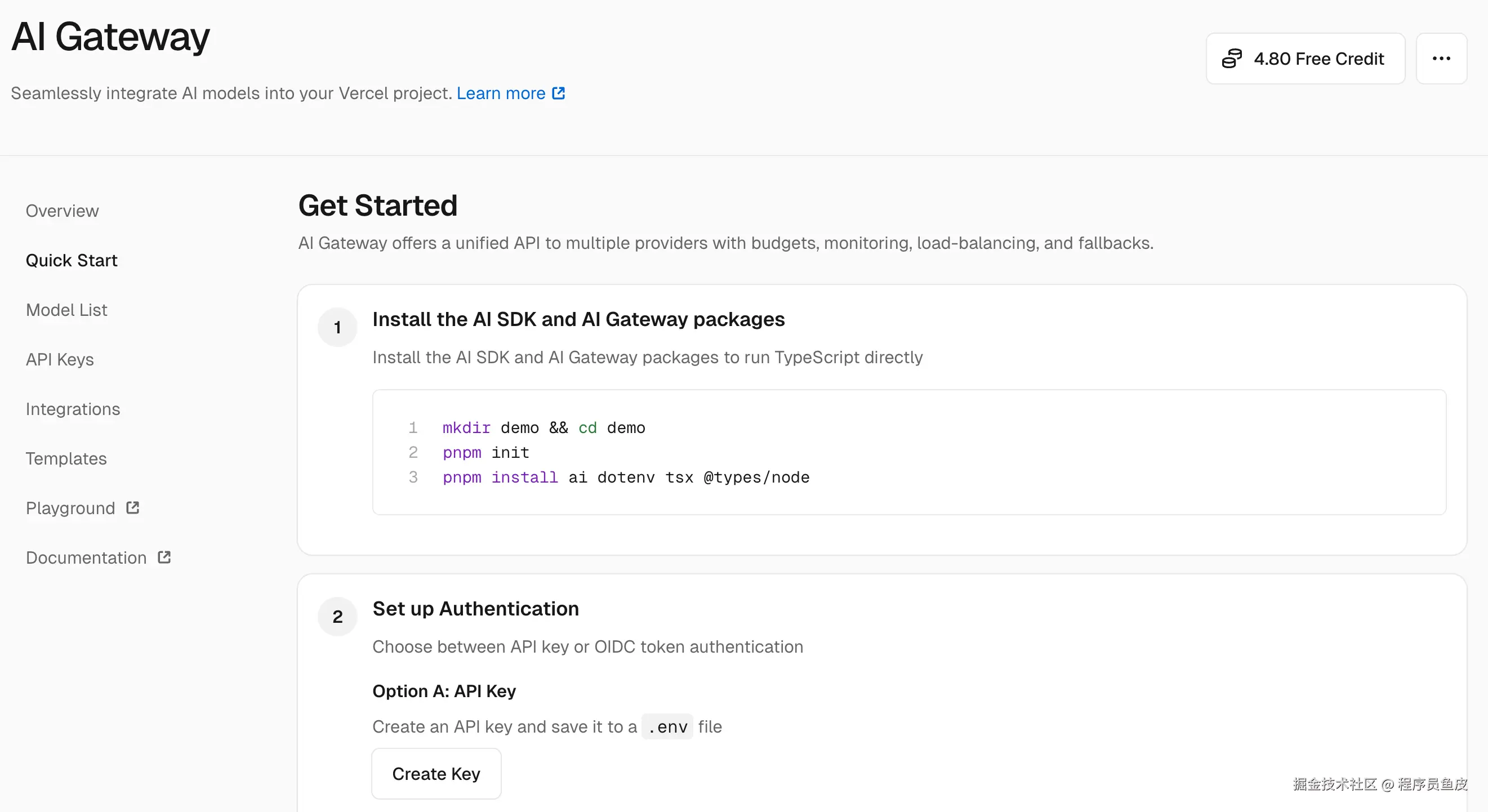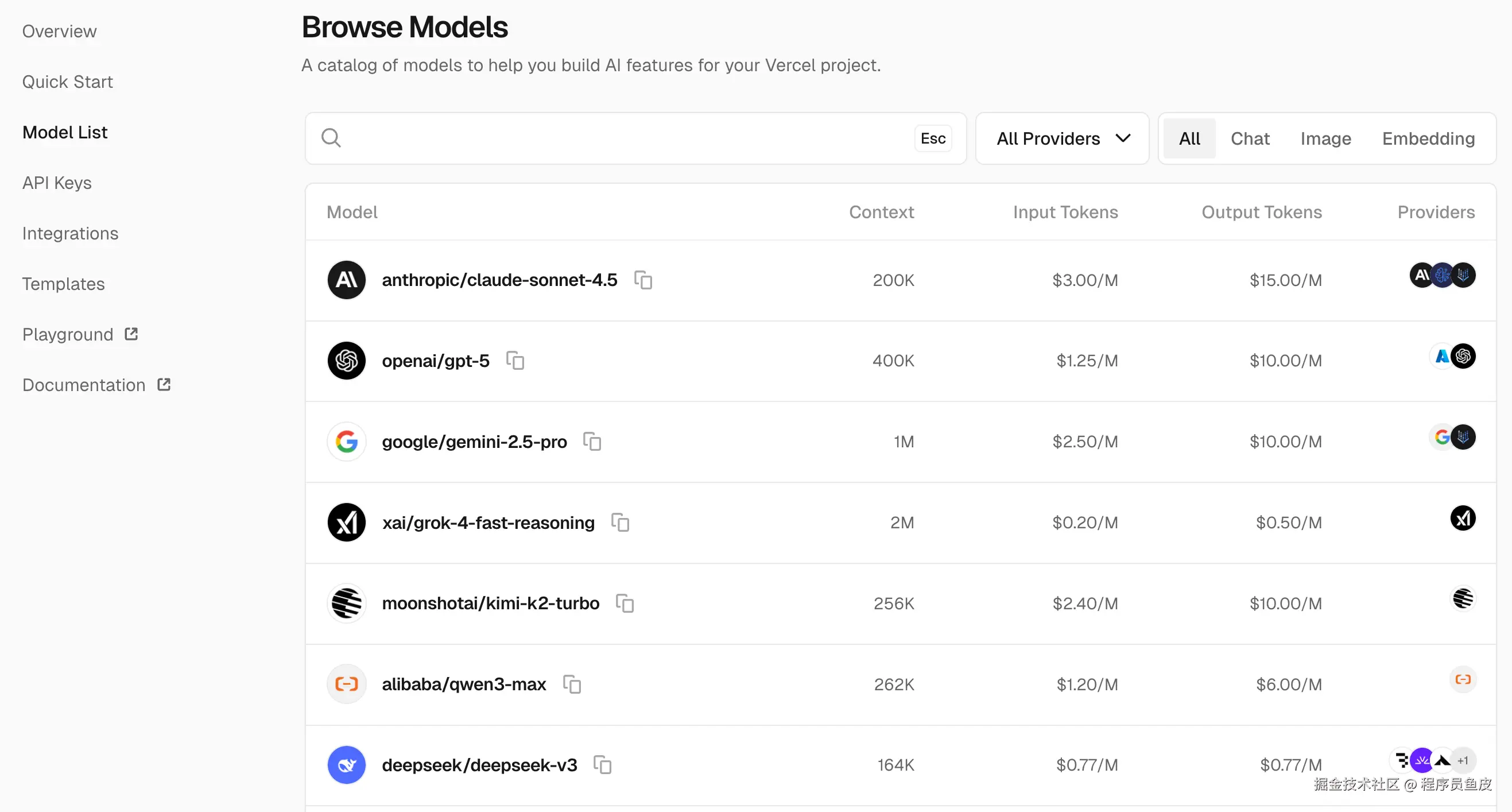 1)Vercel AI Gateway:这是最近很火的一个新产品,最大的特点是上手容易,而且 零加价,如果你使用自己的 API Key,网关本身不收额外费用。适合前端开发者快速搭建全栈 AI 应用。