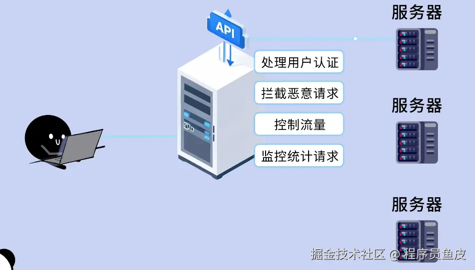 鱼皮:网关就像是火车站的检票口,所有乘客都要先经过检票口,检票员会检查你的车票,然后指引你去正确的站台。