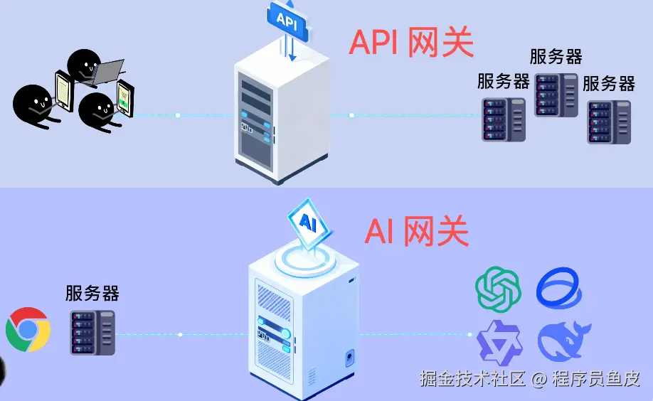 鱼皮:传统的 API 网关通常放在你的应用和各种后端服务之间;而 AI 网关是专门为 AI 应用设计的,放在你的应用和各种 AI 模型服务之间(比如 OpenAI、通义千问、DeepSeek 等等)。